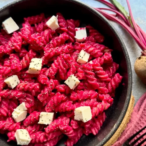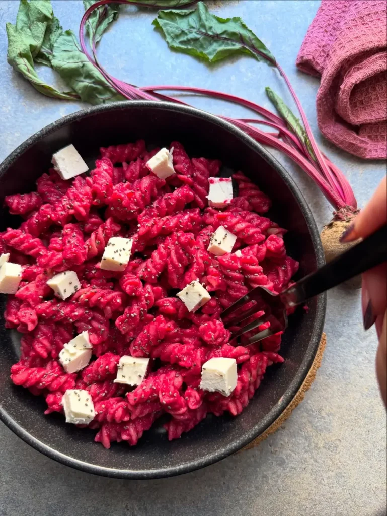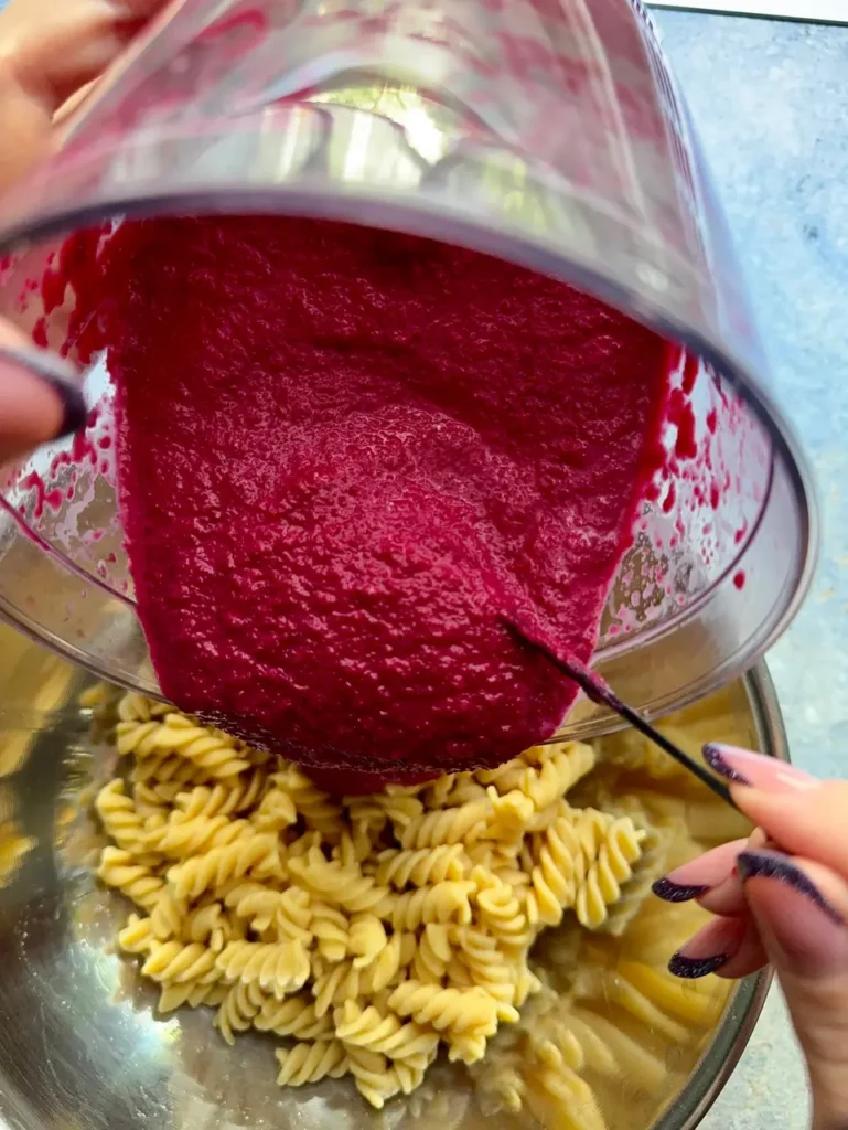- Pour the beetroot sauce over the pasta and toss gently, adding a splash of reserved cooking water to emulsify and create a glossy finish. Reheat gently if needed, but avoid boiling the sauce.