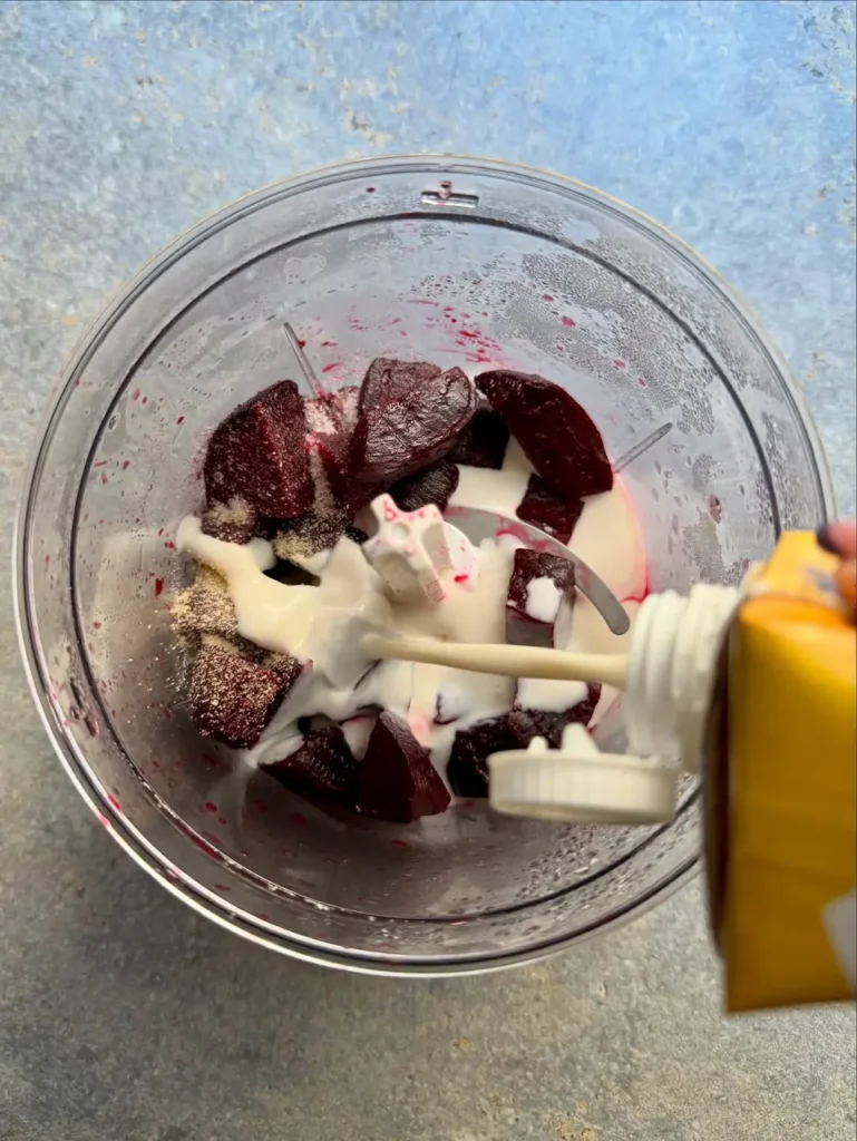 Place the roasted beetroot, oat cream, salt, and garlic powder into a blender or food processor.