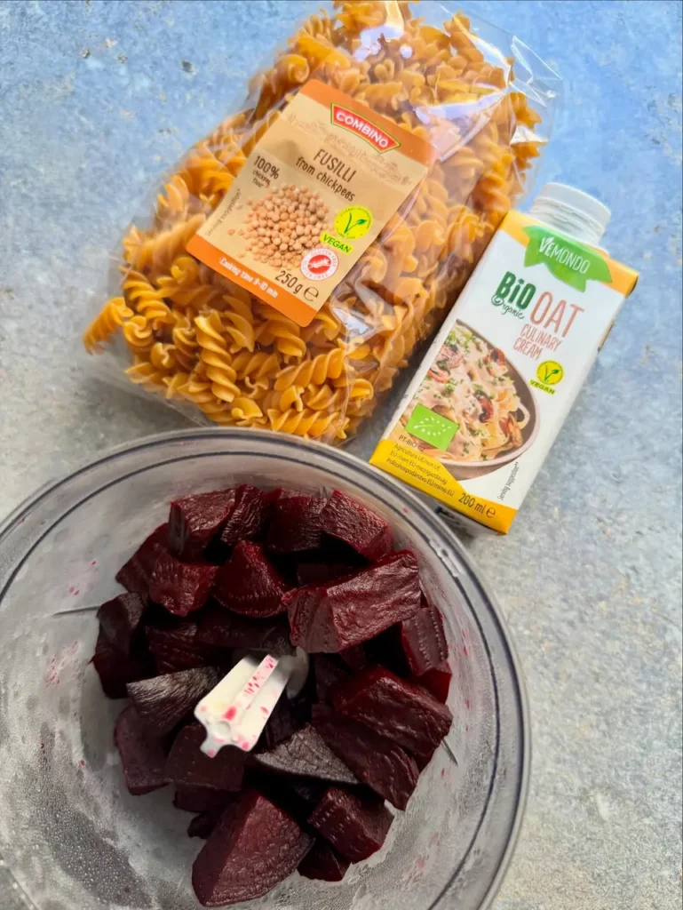 - Add the roasted beetroot, oat cream, salt, and garlic powder to a blender and blend until silky smooth, thinning with reserved pasta water if needed. Taste and adjust seasoning.