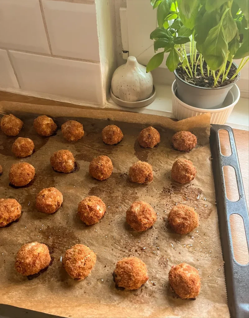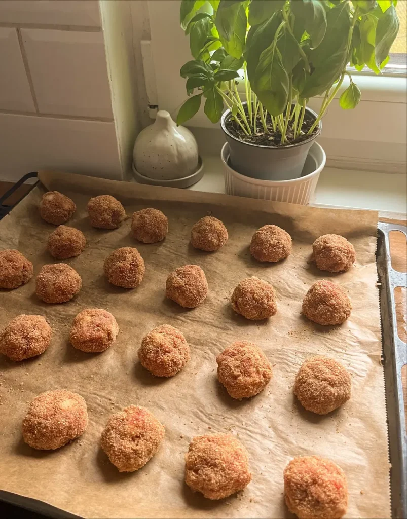 - Preheat the oven to 180°C (355°F) with convection if available. Optionally spray the coated meatballs lightly with oil for extra browning, then bake for about 35–45 minutes until golden and cooked through (internal temperature 71°C / 160°F for beef).