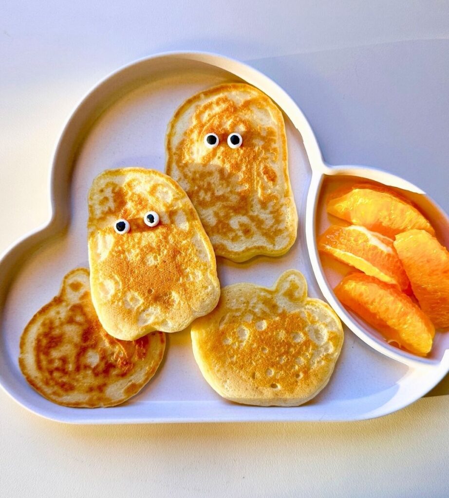 Part of the joy of ghost pancakes is dressing them up. Kids can decorate faces using fruit, chocolate, or syrup.