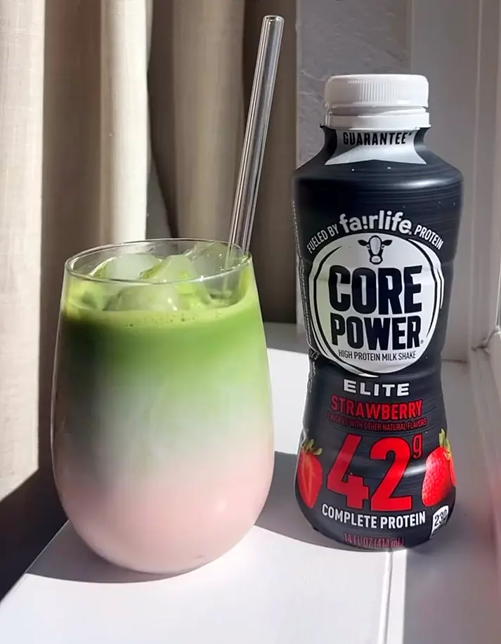 Strawberry protein milk typically contains added milk proteins, which increase thickness and creaminess. This helps the matcha sit beautifully on top instead of immediately sinking.
