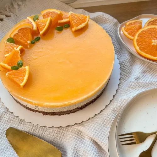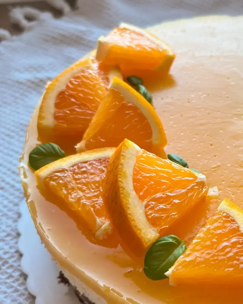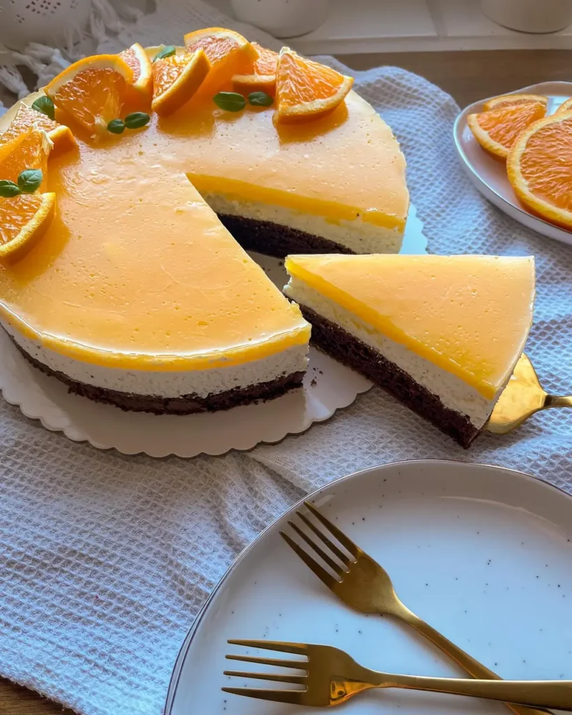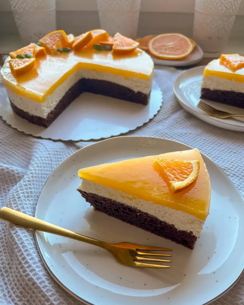 Decorate the top with fresh orange slices for a bright, appetizing look. This cake is best served chilled, with a creamy, tangy, and slightly chocolatey flavor profile that makes it unique.
