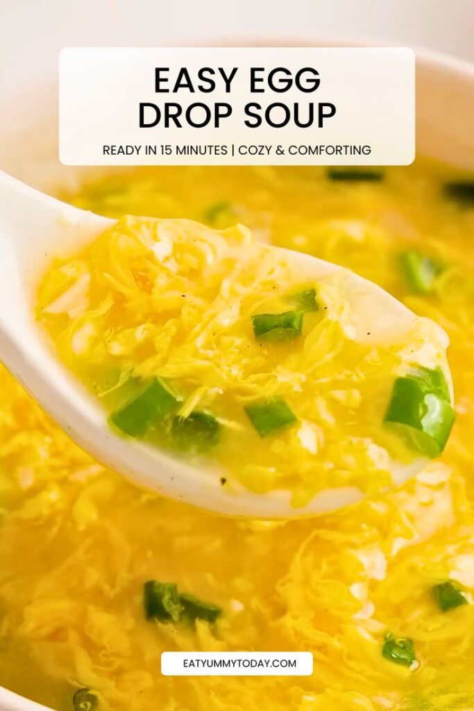 Vegetable Egg Drop Soup works well with peas, corn, or mushrooms added to the broth before the eggs.