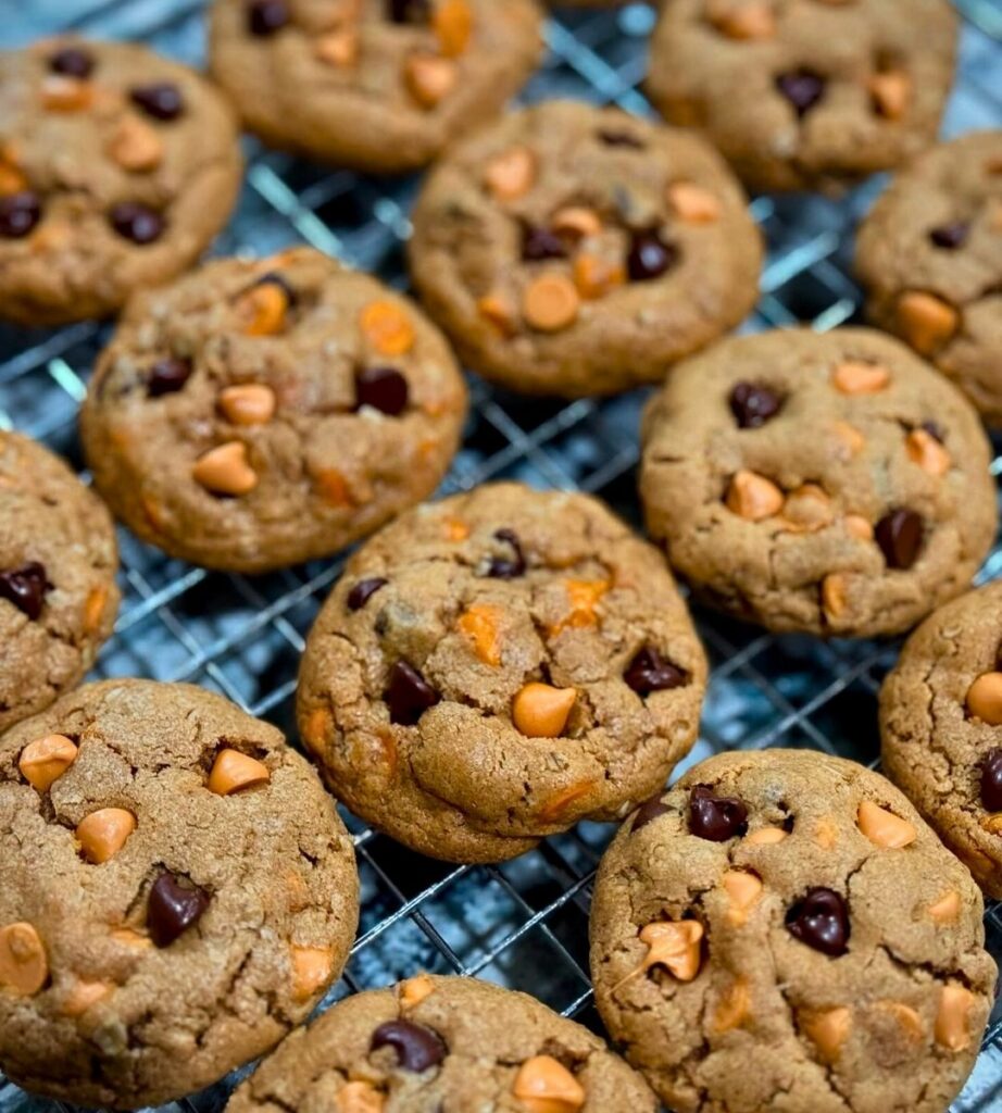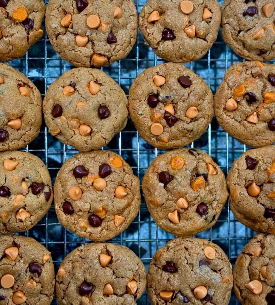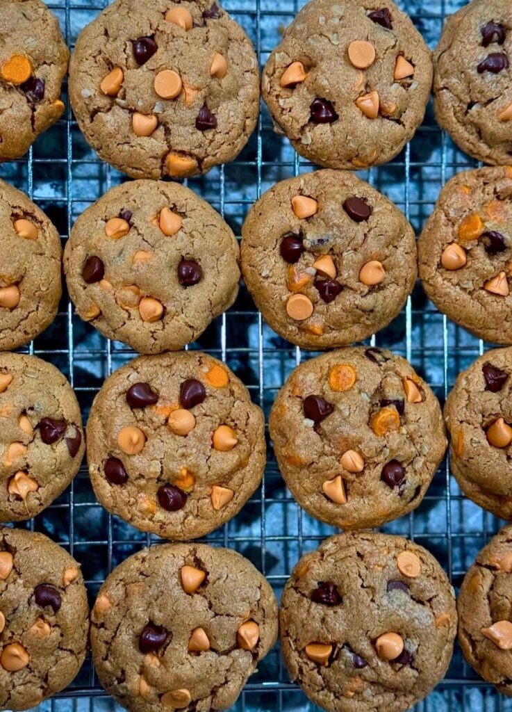 This cookie takes the classic monster cookie concept and dresses it up for autumn. Instead of the usual peanut butter base, almond butter steps in with a smoother, slightly roasted flavor. Pair that with pumpkin spice chips, and you get a cookie that tastes like fall in every bite. The semi-sweet chocolate chips keep things grounded, adding a familiar richness so the spice doesn’t overwhelm. It’s a balance of nutty, spiced, and chocolatey notes all at once—hearty yet sophisticated.