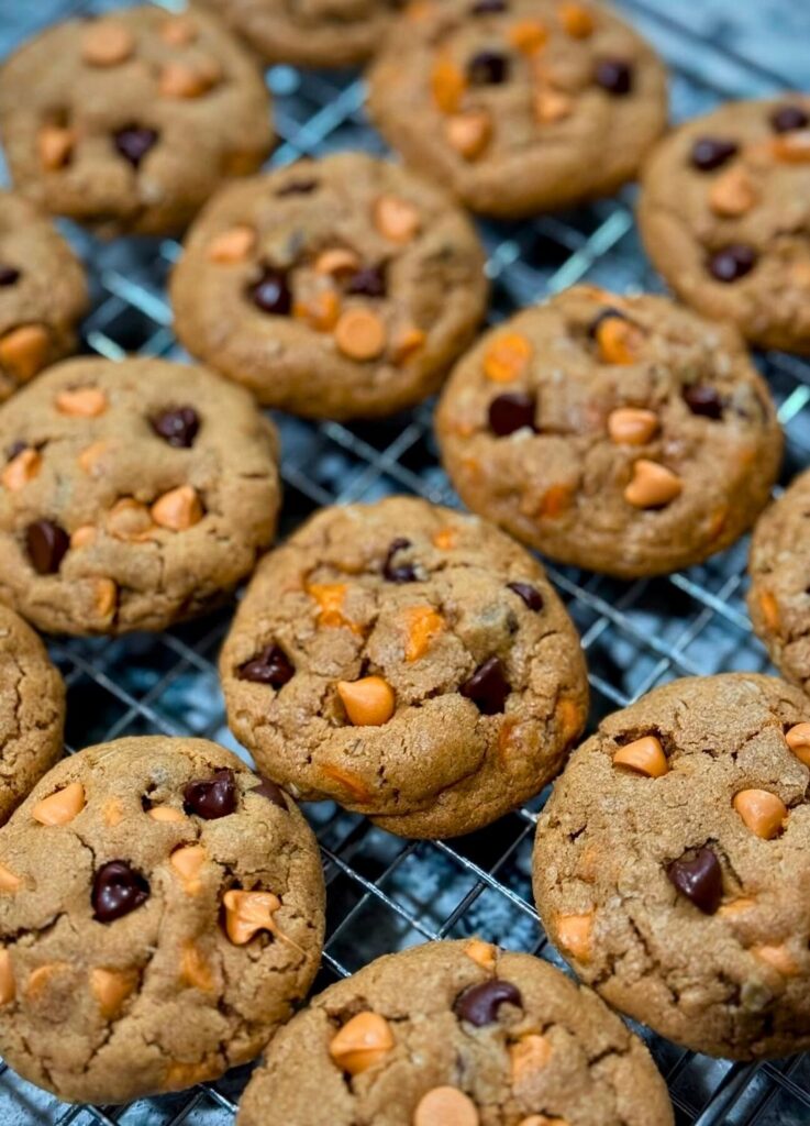 - Immediately after removing from the oven, press extra chocolate or pumpkin spice chips on top of each cookie.