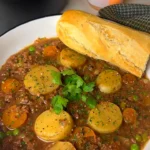 This dish is best served hot with bread that can absorb the gravy. A simple baguette works well because it’s sturdy without overpowering the dish.