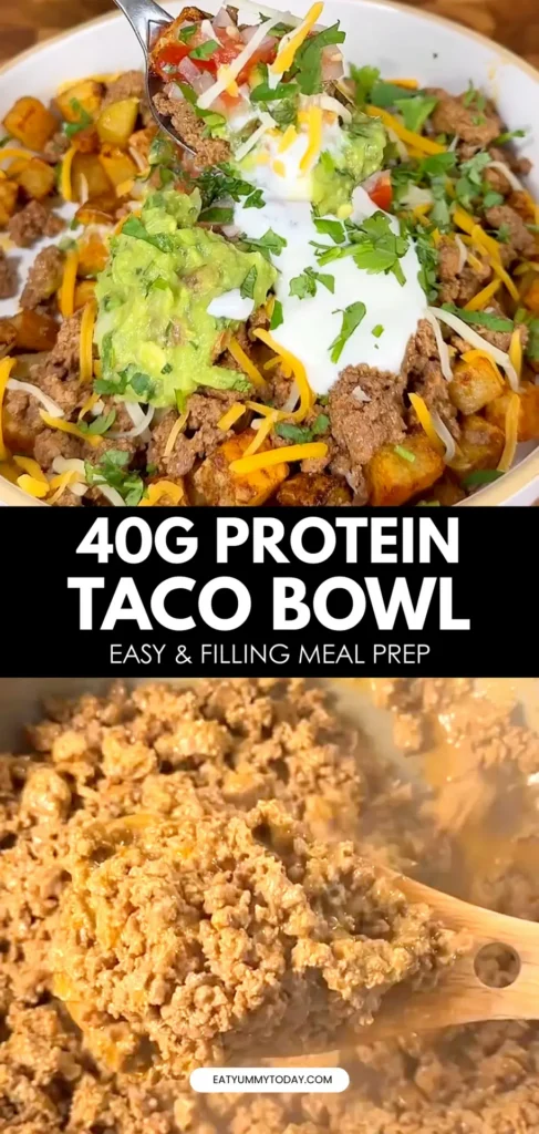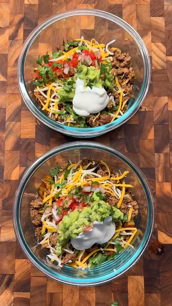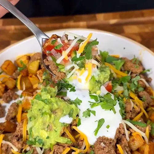 - Assemble each bowl: Start with a layer of potatoes, then add the taco beef. Top with shredded cheese, guacamole, pico de gallo, and a spoonful of sour cream (or Greek yogurt). Garnish with extra cilantro if you like.
