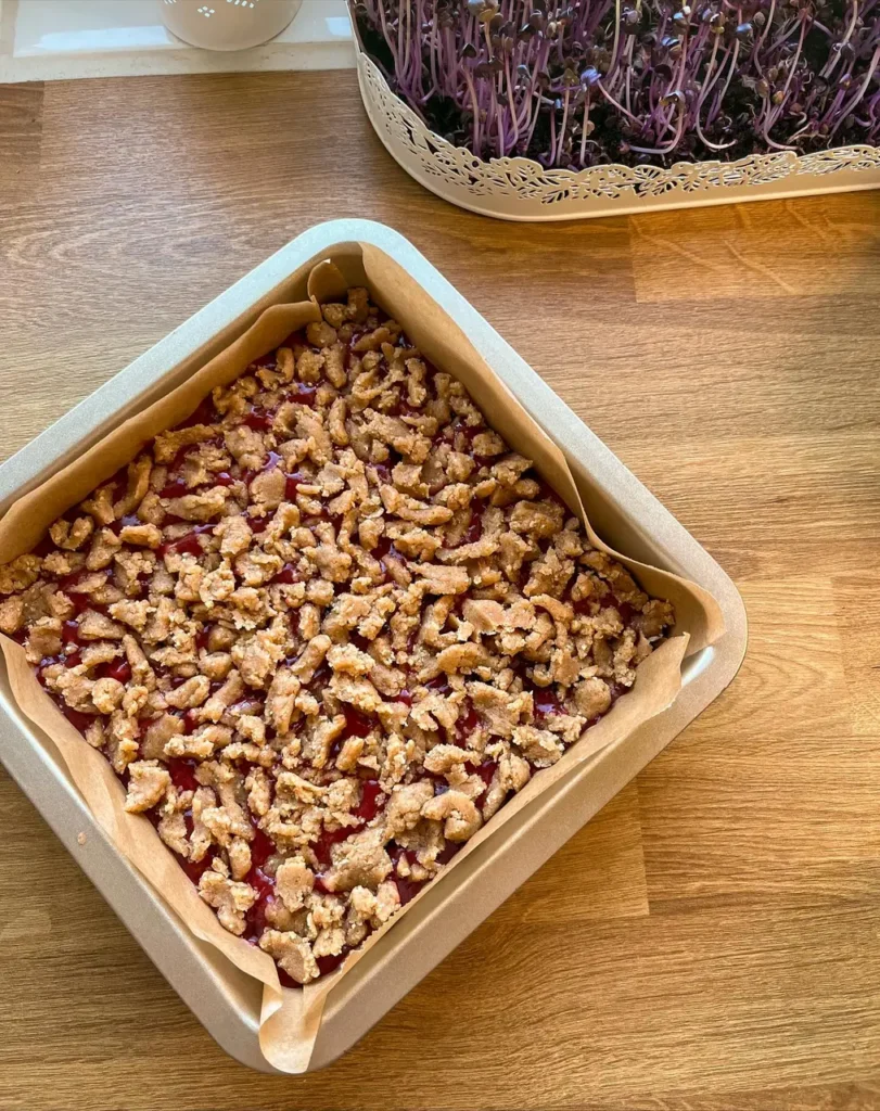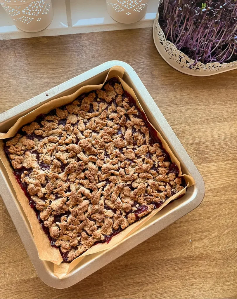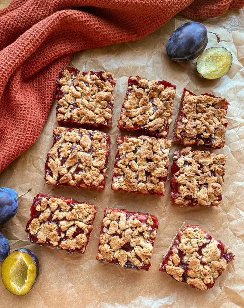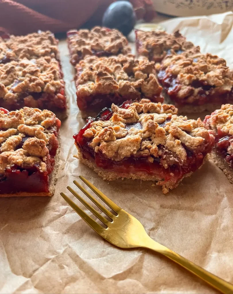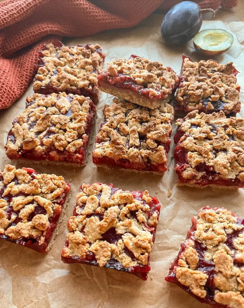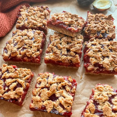 Many plum desserts are either too sweet or too soggy. This plum crumble bar is the opposite: it’s buttery, delicately spiced with cinnamon, and holds together with a tender, slightly crumbly whole-grain shortcrust that showcases the bright, jammy plum filling.